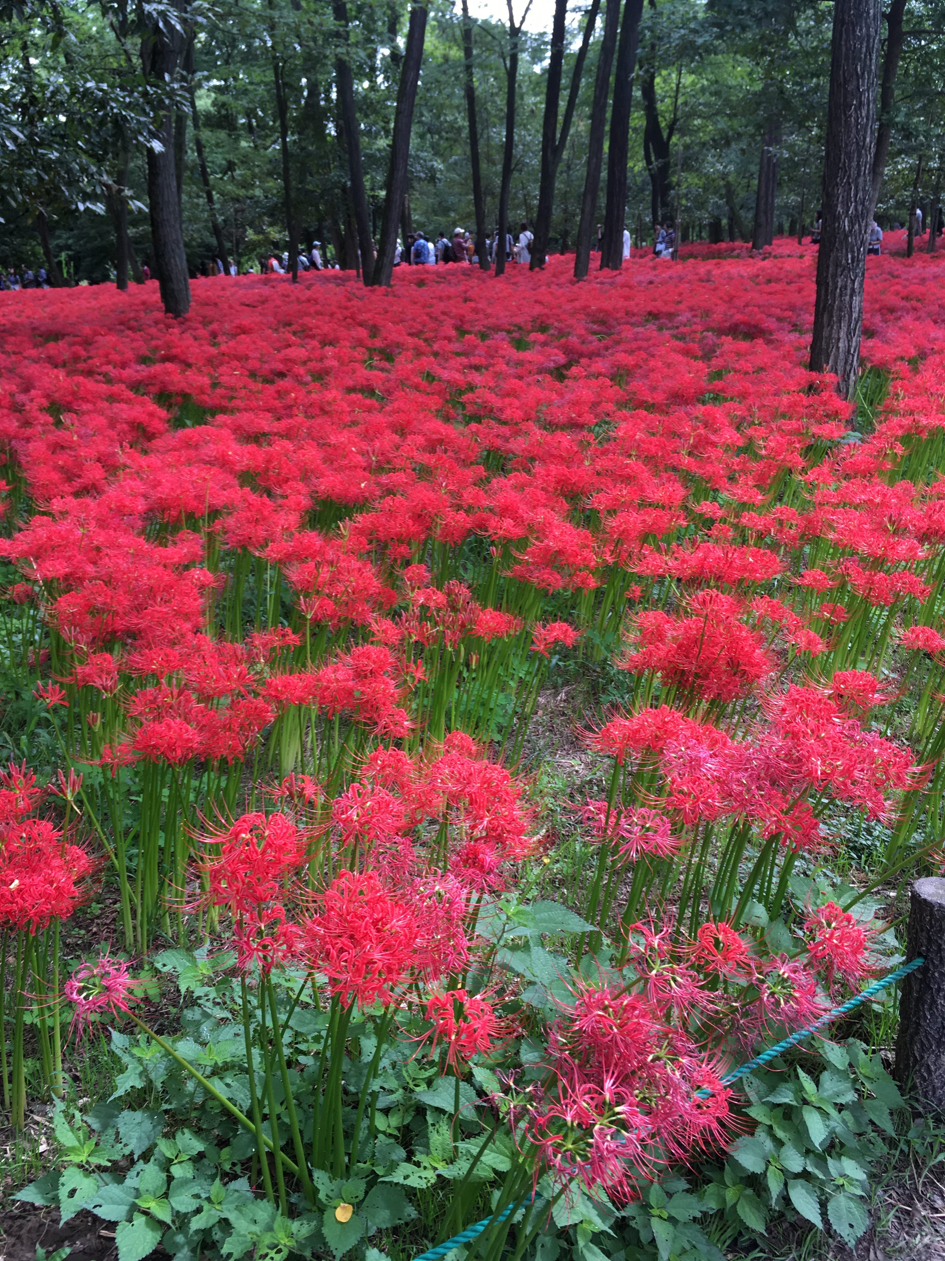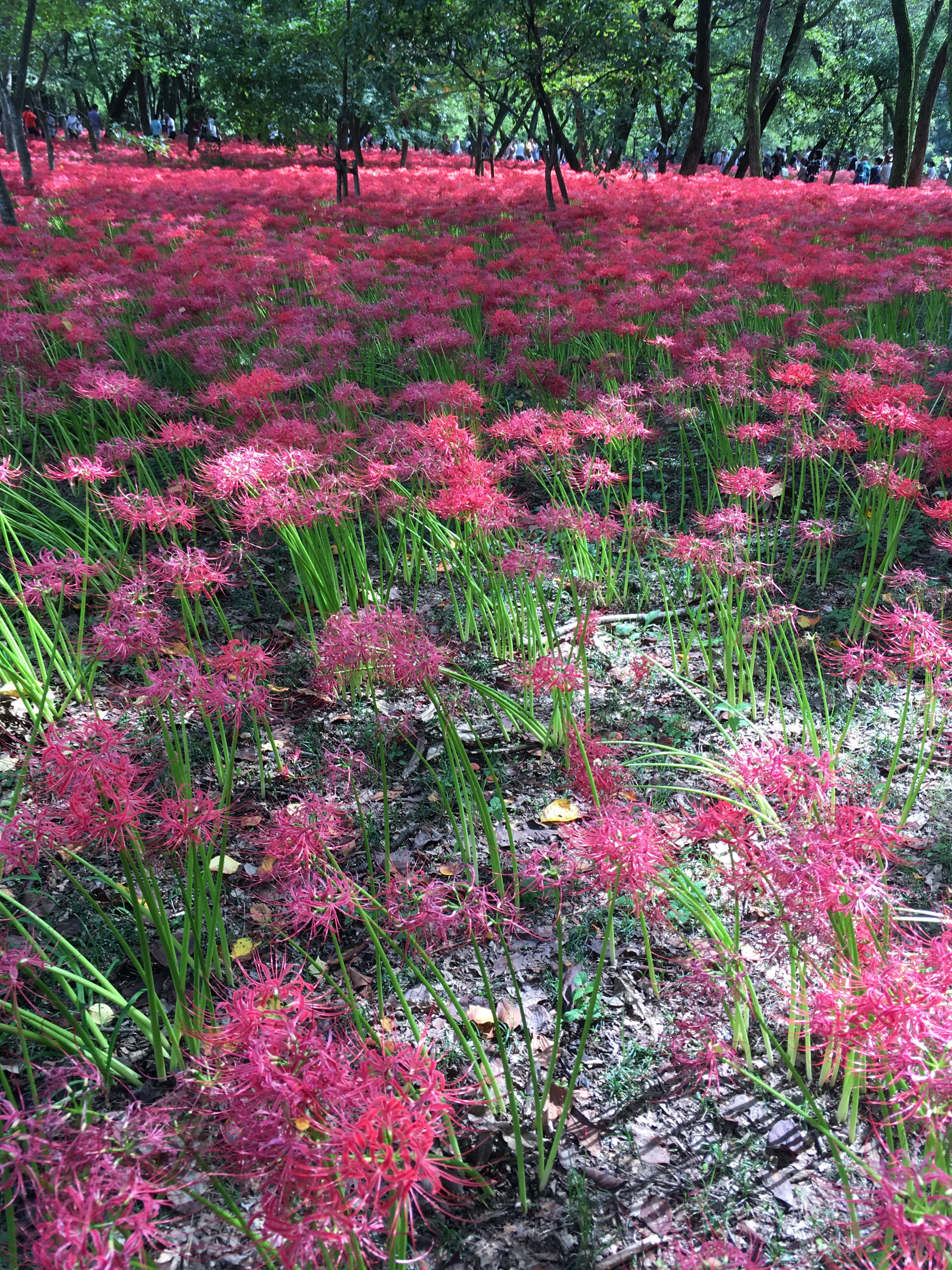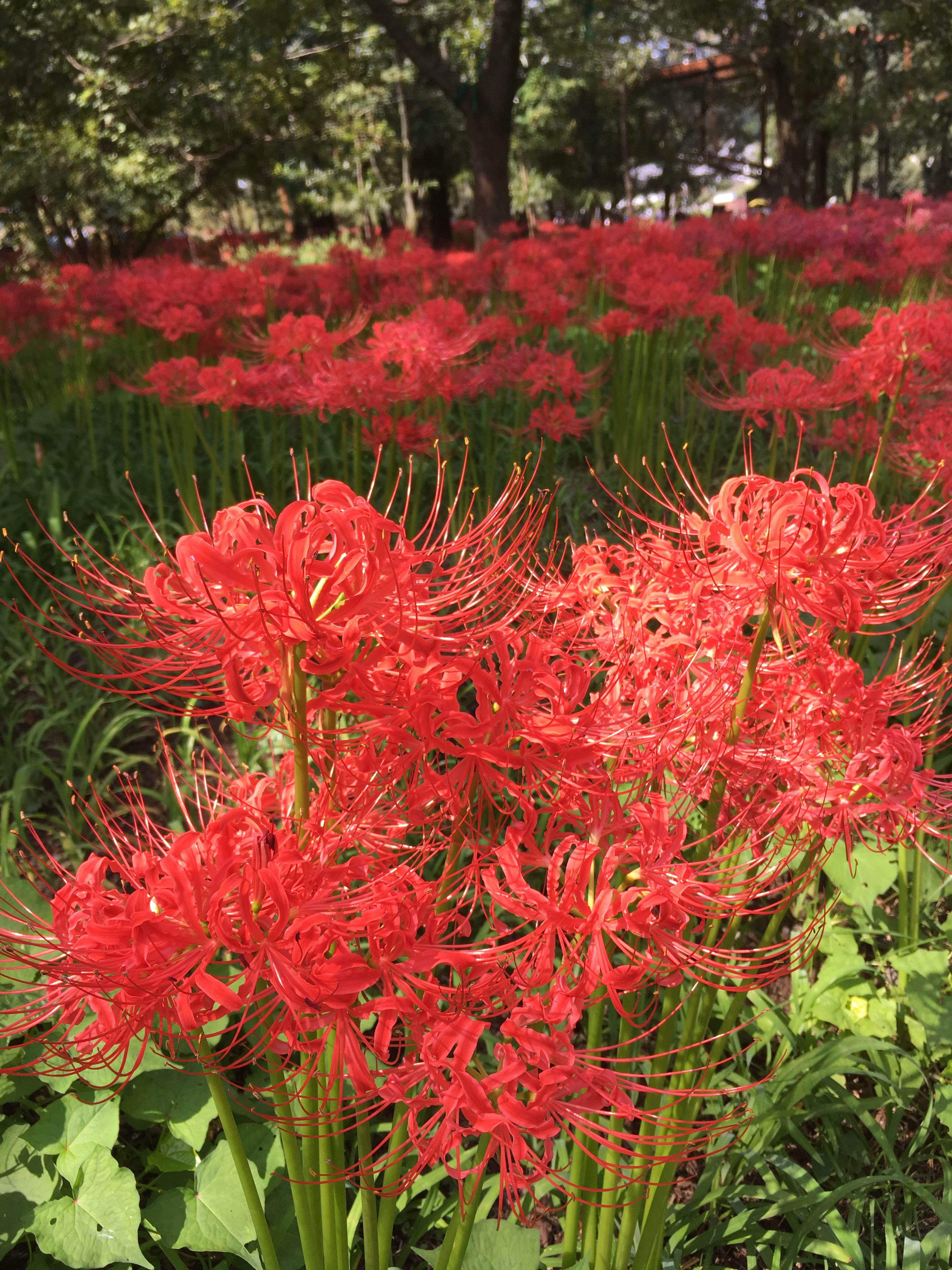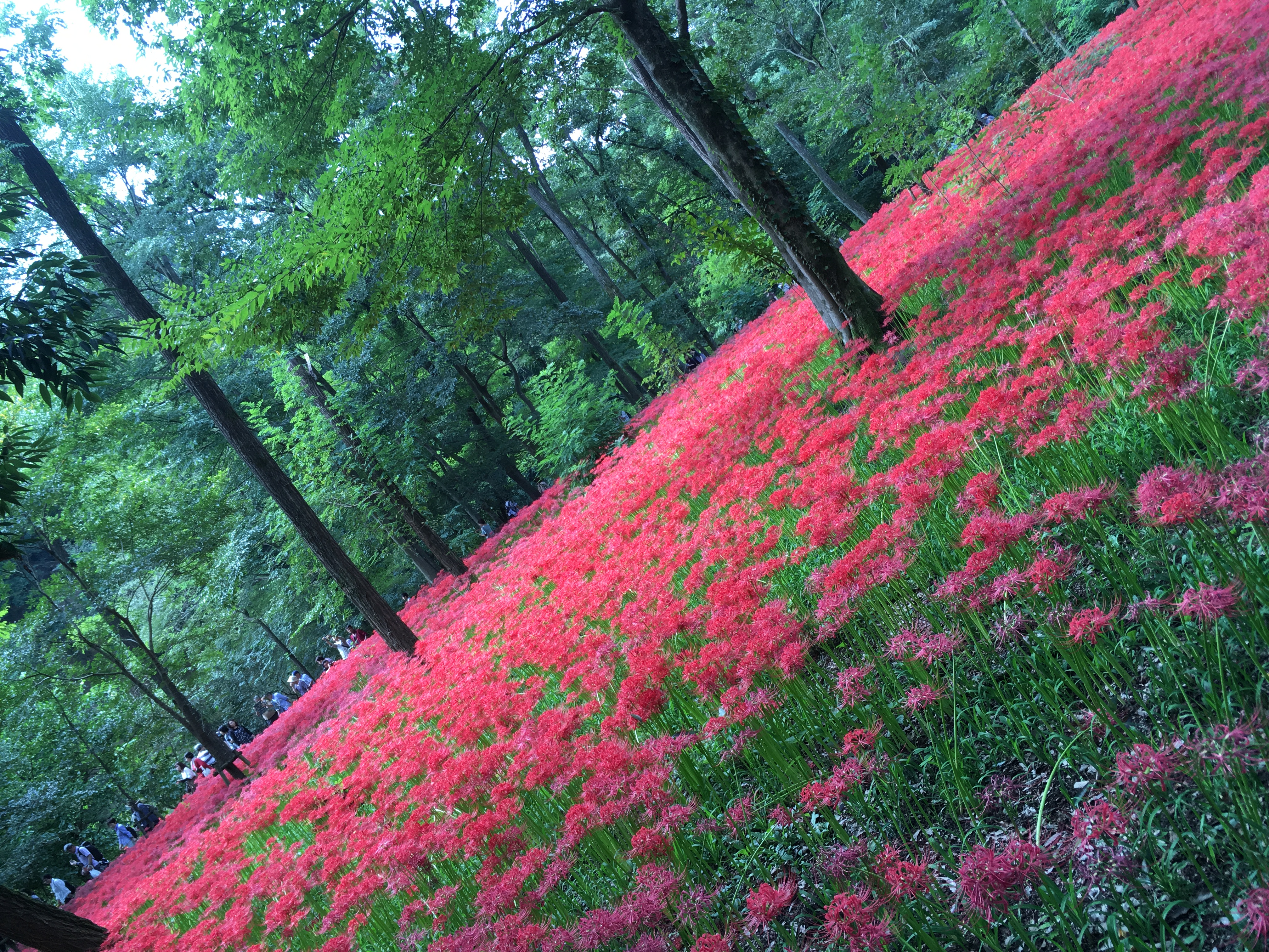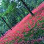 深い緑の中に鮮烈な紅い曼殊沙華の群生がこの世のものとは思えない異質で幻想的な光景を作り出します。日陰や日向で曼殊沙華の印象が異なり、木洩れ日によって疎らに差し込む日差しも美しかったです。