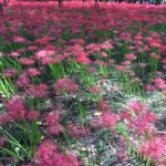 また「巾着田」は、近くを流れる高麗川が蛇行した形が「巾着袋」の形に似ていることから「巾着田」と呼ばれるようになり、川によって円状になった「巾着田」の川岸に曼殊沙華が咲き誇ります。