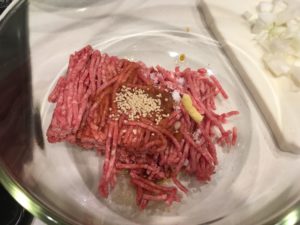 ③ひき肉に、★調味料を入れて、よく混ぜ、②を加えて更にまぜる。