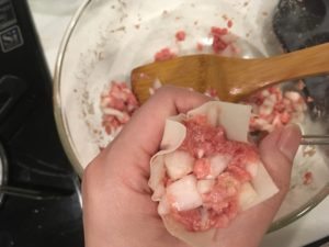④親指と人差し指で輪をつくり、シュウマイの皮を置いて、具を詰める。