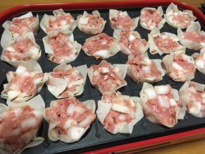 で作るシュウマイです。たこ焼きプレートを使うと、皮はカリカリッとした蒸しシュウマイができます。たこ焼きの型に置くだけなのでシュウマイの型崩れも気にならないのでシュウマイ初心者でも簡単に作れておすすめです。食材も「ひき肉」と「たまねぎ」と「シュウマイの皮」があればできるのでめっちゃラク!